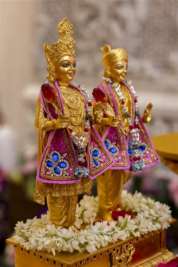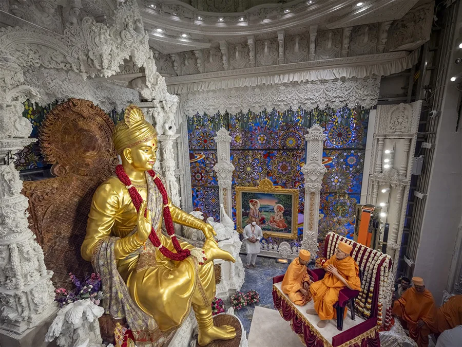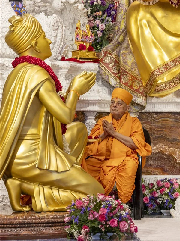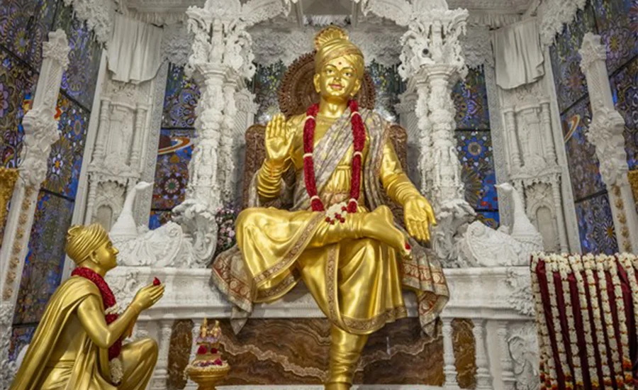 The sculptures at Akshardham Temple can be described as a "history of Hindu civilization in stone". From the giant statue of Bhagwan Swaminarayan, a 19th-century Hindu spiritual leader enshrined in the main hall, to the 49-foot-tall bronze statue of Nilkanth Varni at the entrance of the park, each statue carries religious narratives and cultural symbols. For example, the statue of Nilkanth Varni stands on one foot with the sole facing up in a yoga posture, recreating the saint's 8,000-mile ascetic journey from 1792 to 1799, which lasted for seven years. Its dynamic details and religious implications are eternally frozen through the copper texture.