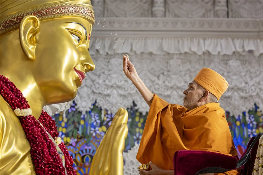 The sculptures at Akshardham Temple can be described as a "history of Hindu civilization in stone". From the giant statue of Bhagwan Swaminarayan, a 19th-century Hindu spiritual leader enshrined in the main hall, to the 49-foot-tall bronze statue of Nilkanth Varni at the entrance of the park, each statue carries religious narratives and cultural symbols. For example, the statue of Nilkanth Varni stands on one foot with the sole facing up in a yoga posture, recreating the saint's 8,000-mile ascetic journey from 1792 to 1799, which lasted for seven years. Its dynamic details and religious implications are eternally frozen through the copper texture.
